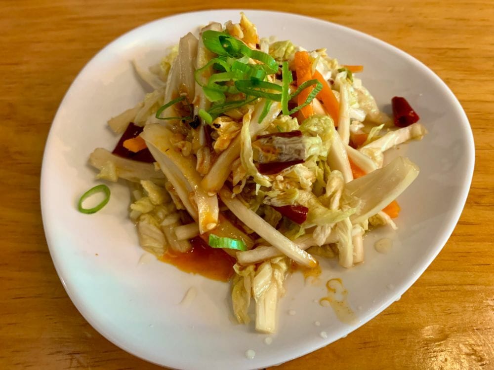 Yet my favourite appetizer here is a pickled cabbage salad, loaded with plenty of dried red chili and dressed in Chinkiang vinegar (aka black vinegar made from brown rice). Black vinegar has an intense umami effect and if you’re a little addicted to this sensation then this salad will have you at the trough and no amount of szechuan peppercorn spice will stop you. The cool vegetable crunch is in sharp contrast to the seasoning and an adventure in itself.