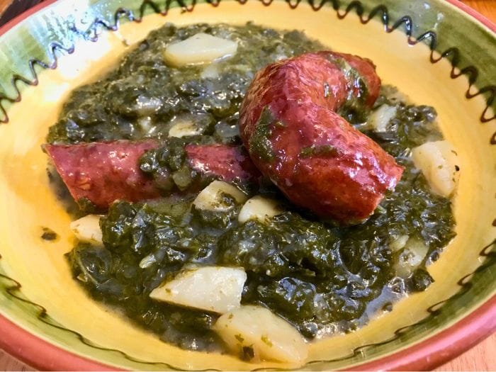 Plate the kale potato stew into shallow bowls and top with sliced rounds of sausage