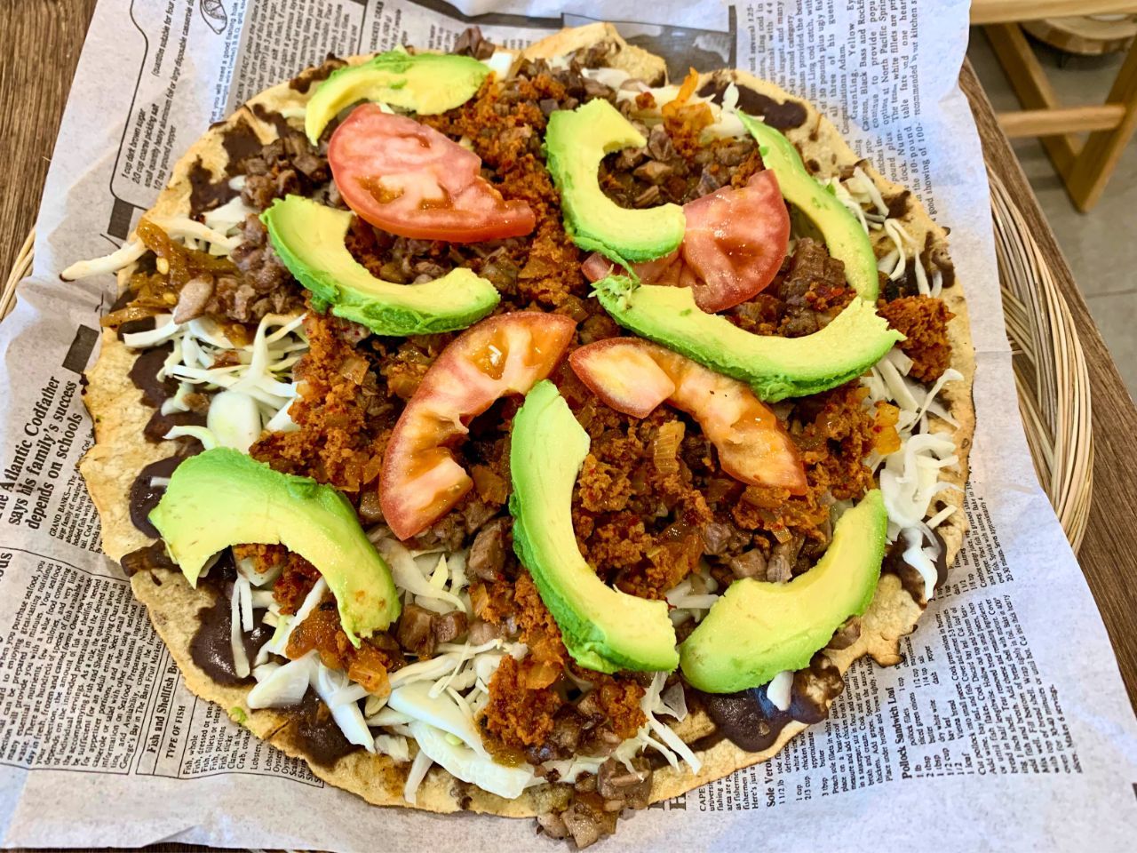A crisp homemade corn tortilla is painted with unrefined pork lard (asiento) and refried black bean paste. It’s then layered with shredded cabbage, quesillo (Oaxacan cheese), grilled beef strips, in-house crumbled Mexican chorizo, fresh salsa, tomatoes and avocado.