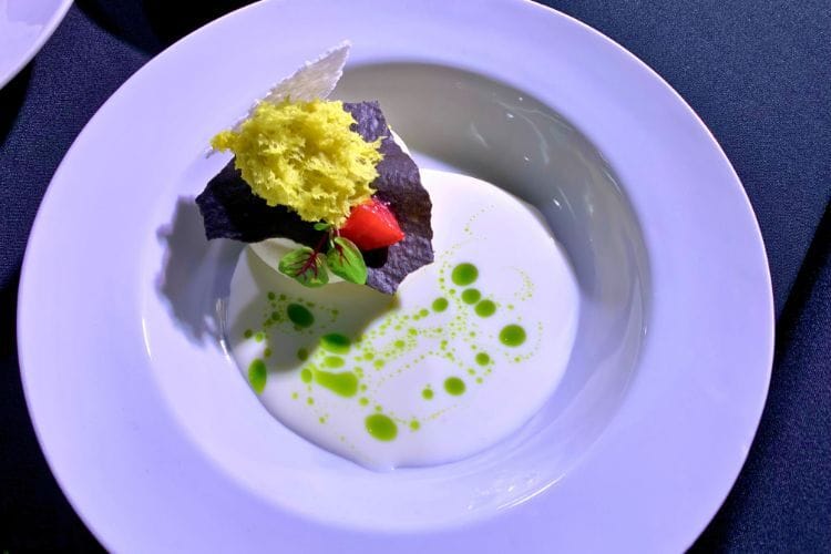 His composition involved burrata mousse, strawberry kombucha confit, Japanese sweet potato cake, Manitoba bass bone tuile, duck fat caramel, kombu and shiitake black sugar dust, apricot kernel cream, basil and kaffir lime oil, microgreens and a dehydrated milk chip. Writing that took longer than to eat the thing. It was just that good.