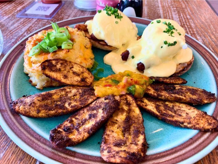 I opted for the classic benny with sausage with sides of cheesy potato cake and plantains with mango salsa. First up, however, was a virgin Caesar. I was in the mood for a savoury jolt.