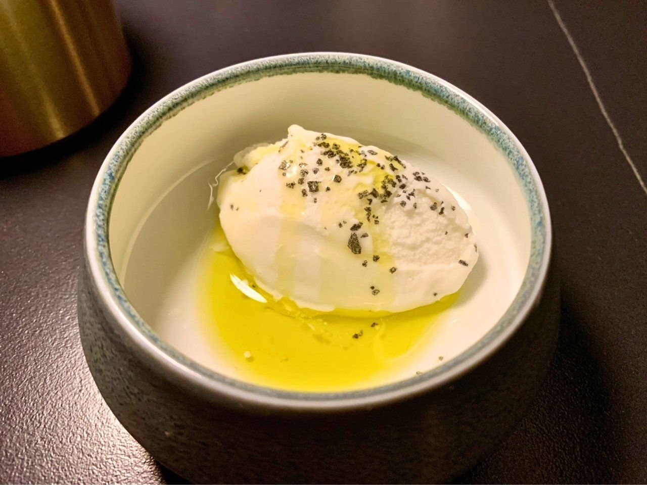 As a bit of a surprise, an amuse bouche of coconut sorbet with flakes of black maldon salt and extra virgin olive oil arrived. It reminded me of the fresh cut coconut my father dispatched, after draining it, using a machete. It was an inspired take and I don’t know that I’ll ever appreciate coconut sorbet any other way.