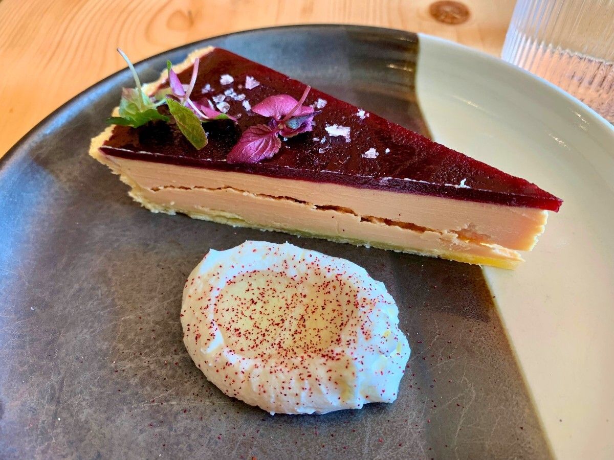 This was followed by dessert. A slice of foie gras tart topped with a cherry gelée and a side of crème fraiche dusted with black currant and aronia powder. In the centre, a bittering note in the form of magnolia oil.
