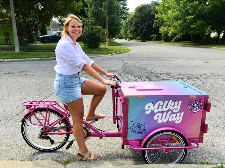 Her pink power pedal ice cream cart can hold up to 300 ice cream sandwiches and as the popularity of her products has grown, she now travels with a backup supply stored in a cooler.