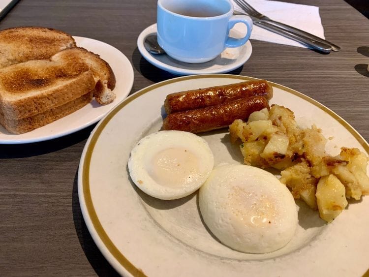 I asked for poached eggs, and it’s common now to find some eateries using an egg-poaching device. It’s not at all the experience of a properly poached egg but it was cooked as requested and came with a side of standard breakfast sausages.