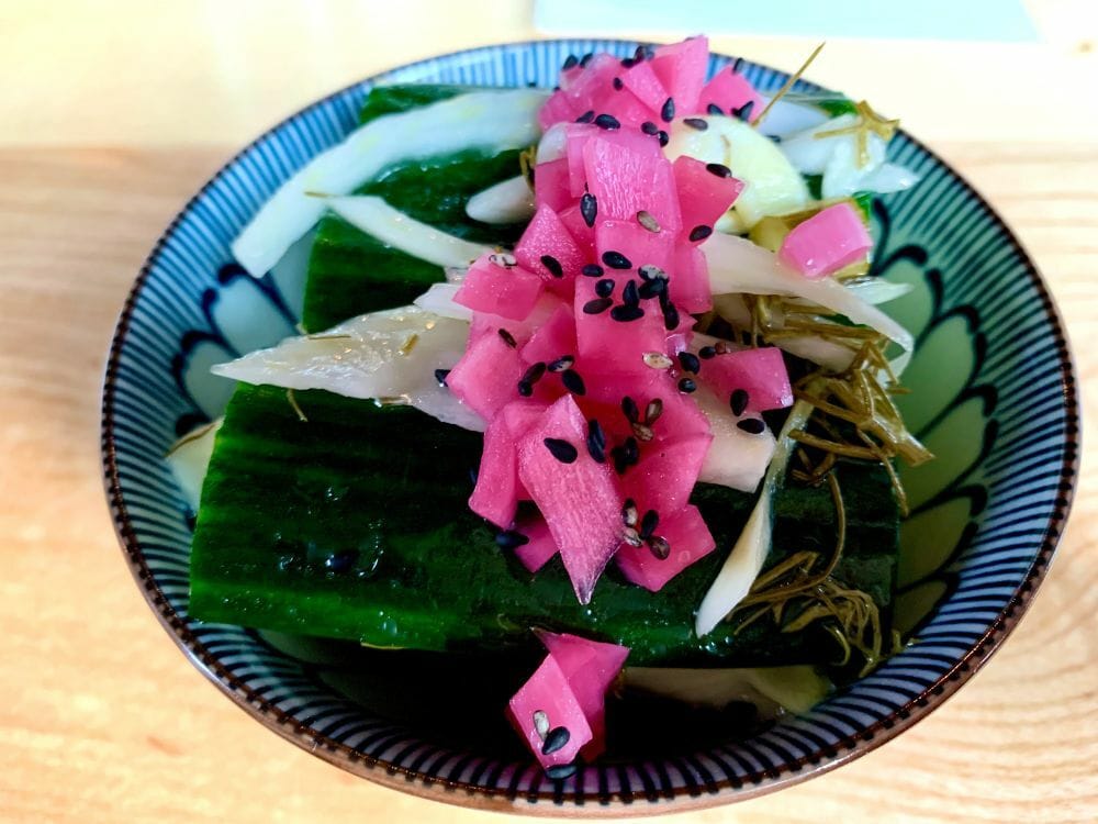 The salad arrived in short order and the large cut cucumber pieces were sweet, crunchy and fresh-sprinkled in a dressing that felt sharper than the described rice vinegar. A minor quibble as it was ultimately very pleasant and colourful.