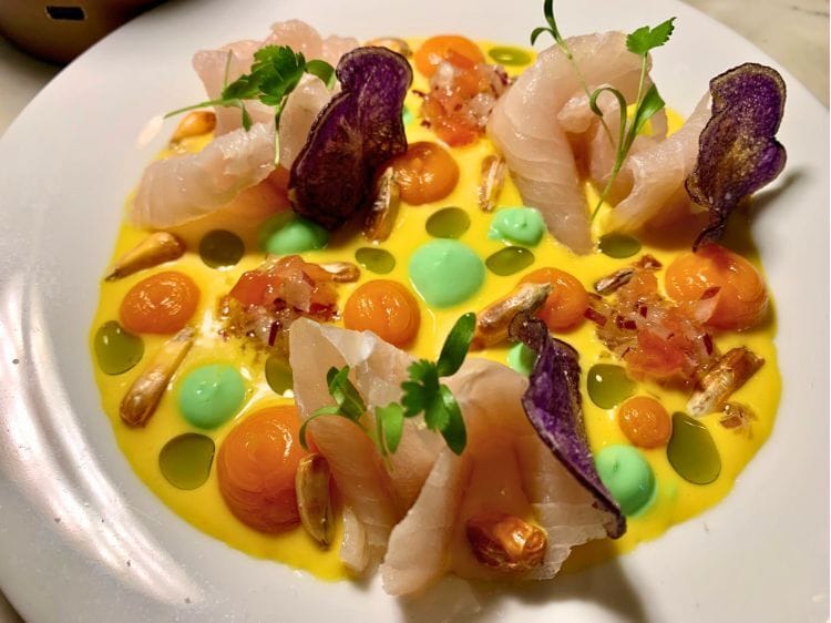 The Mahi Mahi Tiradito was a pop art explosion of sun yellow, luminescent green and 70’s orange. It consisted of raw sliced Mahi Mahi interspersed with dots of sweet potato (cooked in orange syrup), avocado, and pieces of extra nutty toasted Pulpe corn.