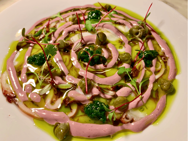 She was helping the team in the service of some signature dishes and soon, I was looking at an abstract composition of sliced octopus, capers, olive oil, chimichurri and olive sauce all sprinkled with micro-greens.