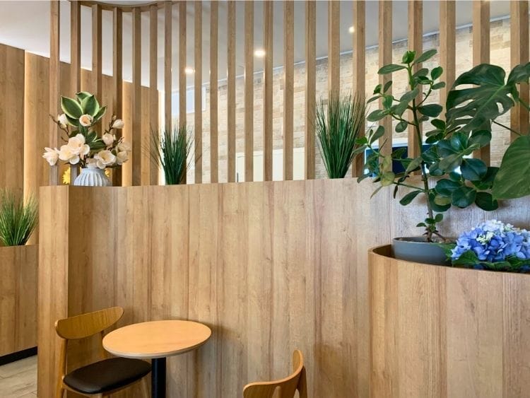 On the landing to your left are more stairs up to Sakura Sushi. It’s a calming, blonde wood space with a few tables that are shared with those enjoying Korean hot dogs and tea from the venues below.