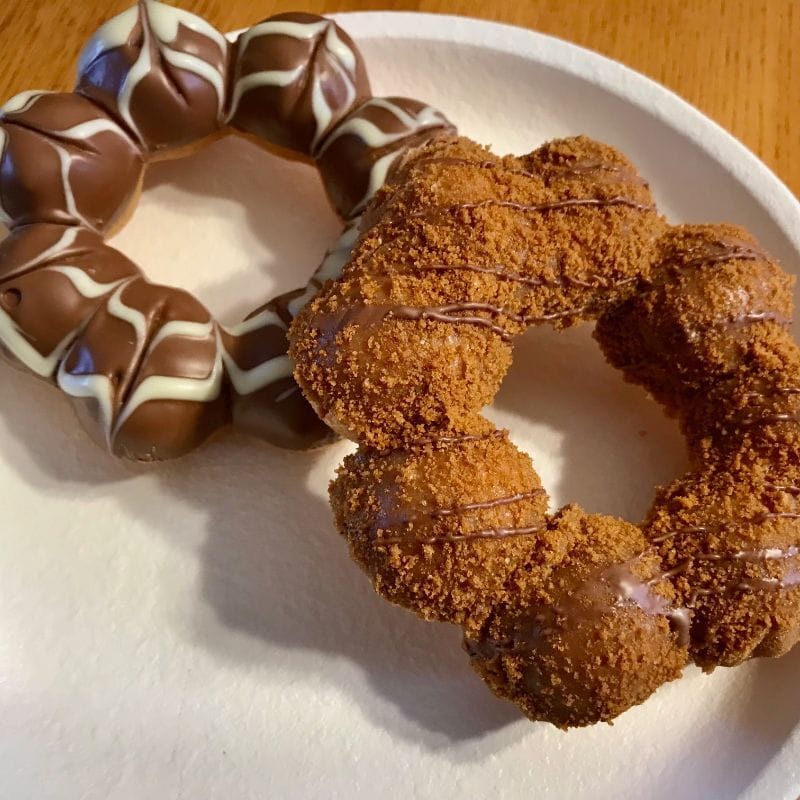 They are in no way as chewy as straight ahead mochi but you’ll recognize the chewiness as something other than a regular donut. I cut the individual segments to make for easy eating and it’s a good way to share different flavours.