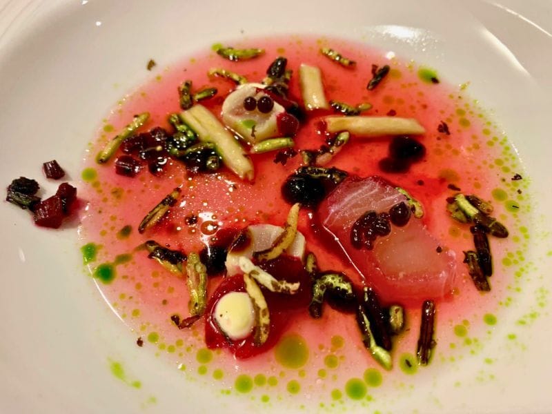 What an invigorating invention he offered with a soy and beet cured albacore tuna, puffed wild rice, ponzu gel, pickled shimeji mushrooms, tomato water and beet green oil. The experience is still rattling around my head as one of the most memorable tastes I’ve enjoyed in years.