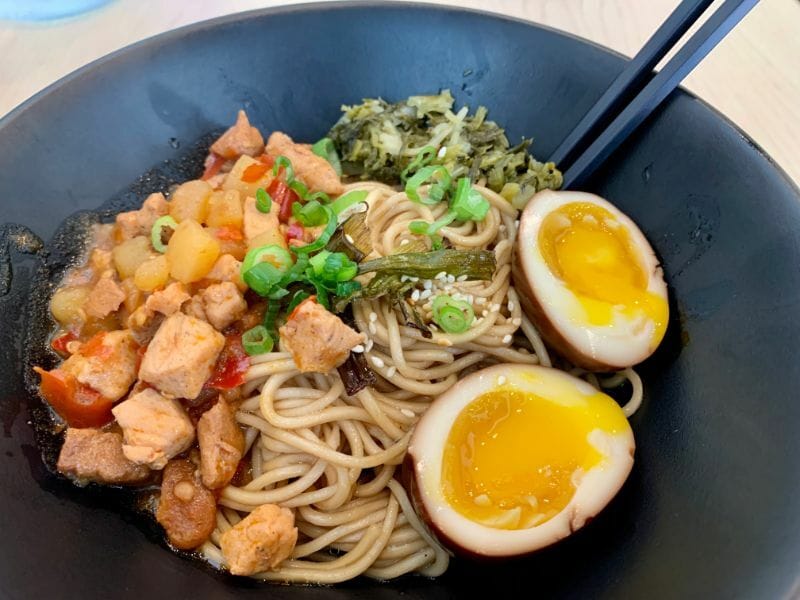 The noodles here are first rate. A quality wheat noodle is both tender and offers some resistance on biting. These are accompanied by pickled greens, cubed pork and potato, scallions, sesame seeds and a sweet soy cured egg.